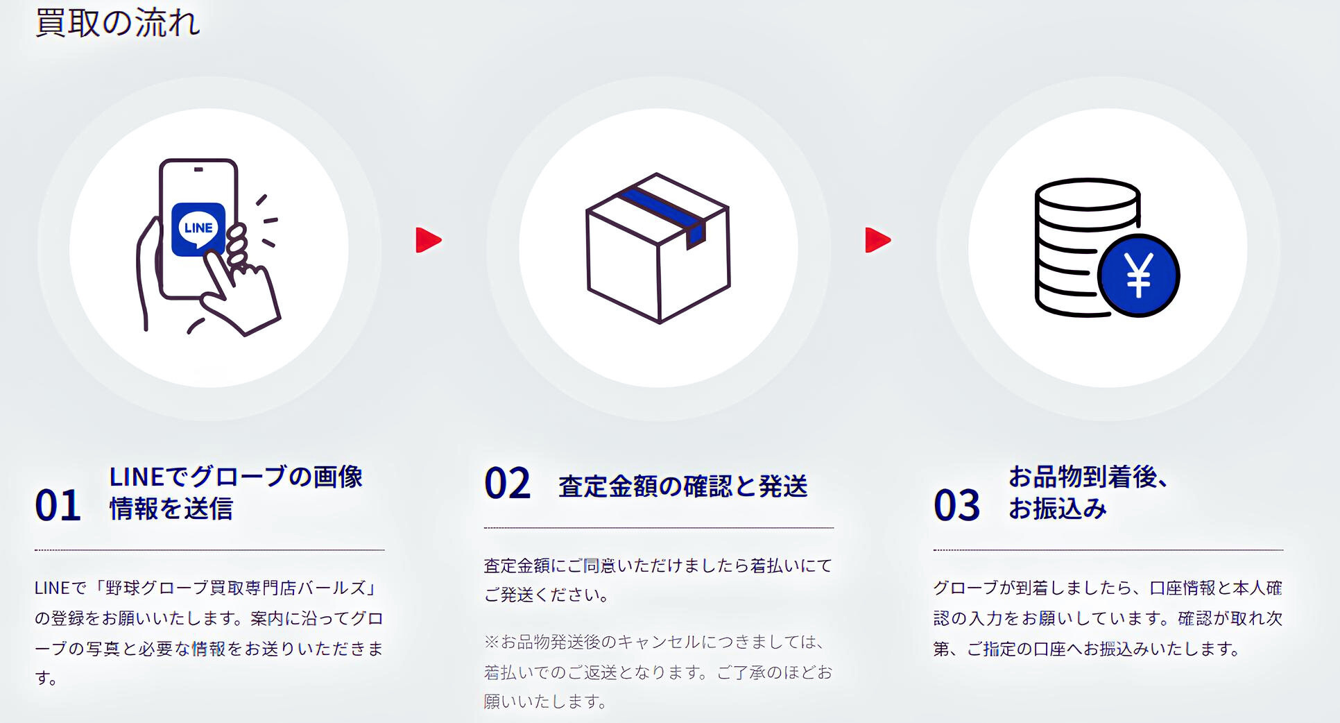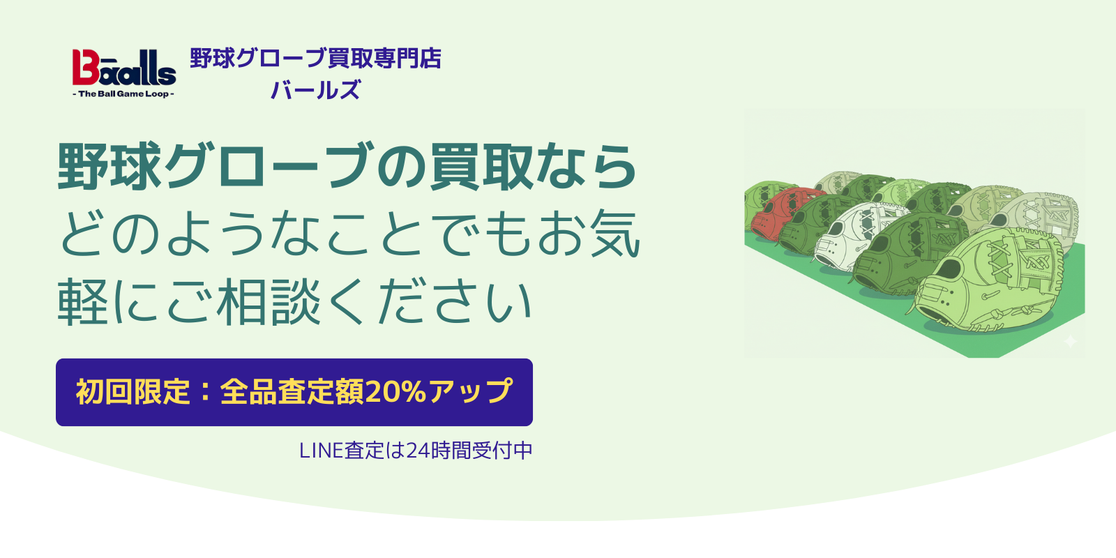 LINE査定で金額提示をさせていただきます。フリマアプリで負担になりがちな、神経を使うような梱包や、発送後の相互評価に気をもむ必要はありません。スマホでグローブを撮影して送るだけで、査定から買取まで気兼ねなく完了します。